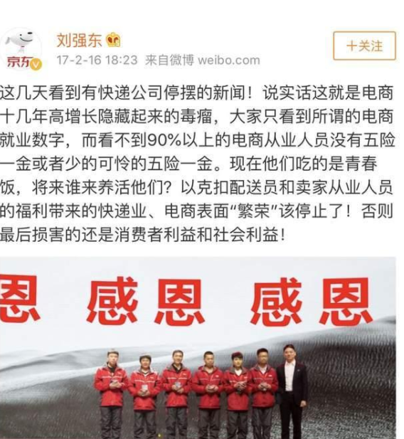 曾幾何時(shí),自建的物流體系一直是劉強(qiáng)東心中最自豪的部分,每年都要在微博上提一嘴他為京東數(shù)萬(wàn)名基層員工繳納五險(xiǎn)一金,提供遠(yuǎn)超同行的保障,如果不給基層員工交五險(xiǎn)一金,而是通過(guò)勞務(wù)外包,京東一年可以多賺50億。